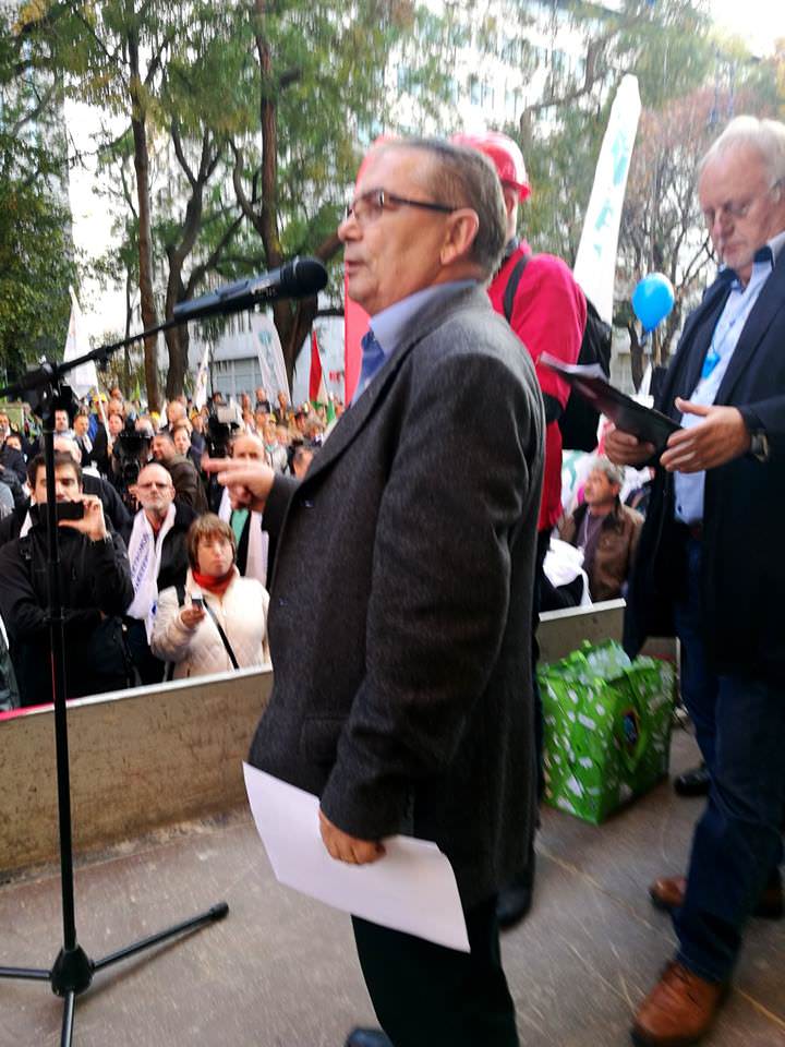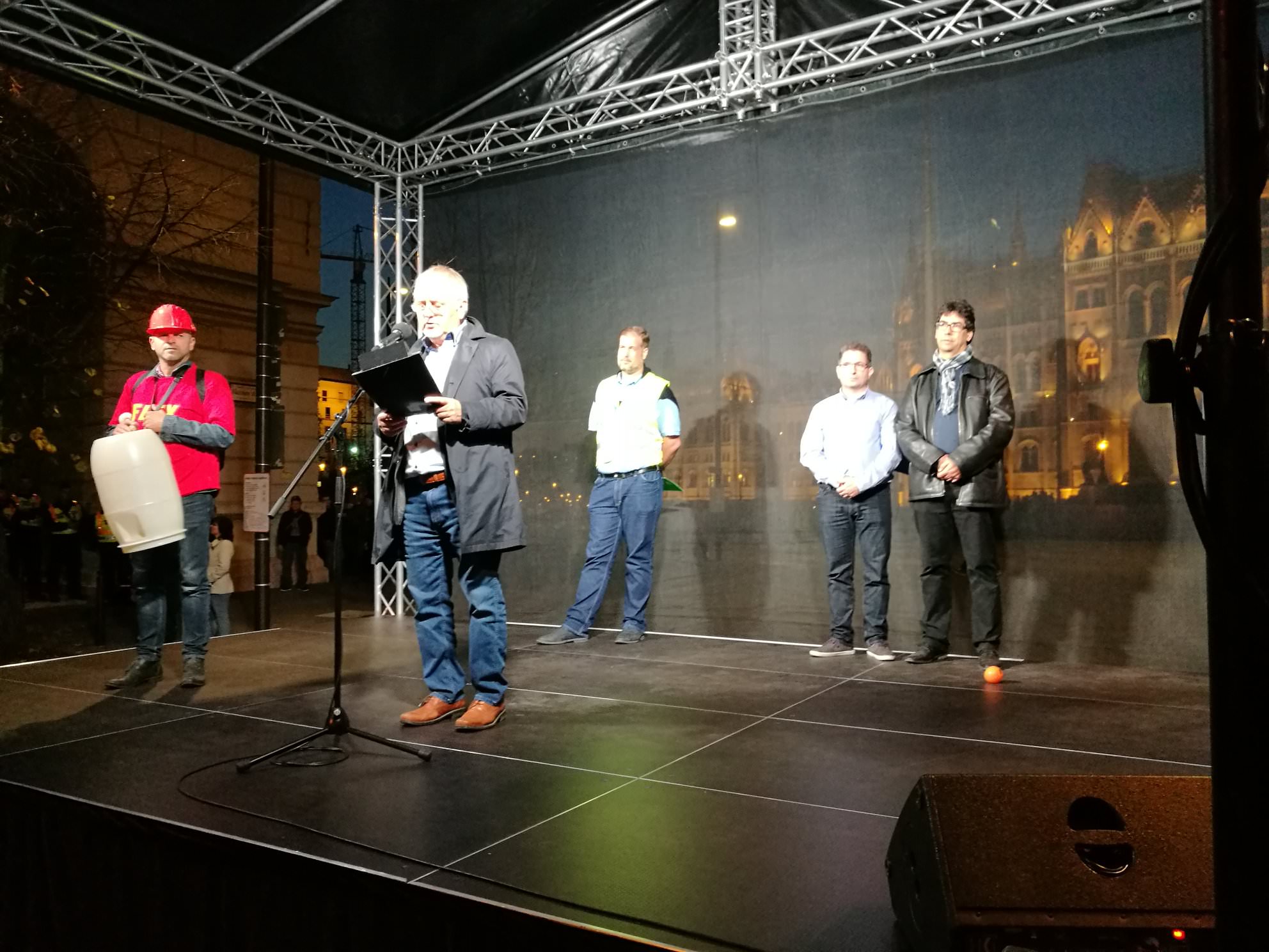 A tüntetők innen az Országházhoz vonultak, ahol Hatvani Jácint, a Műszakos Dolgozók Érdekvédelmi Szervezetének elnöke kijelentette, „a politika durván beleavatkozott a munka világába”, mert a kifogásolt intézkedés a fejlett munkakultúrát meghonosító vállalatoknál a munkavállalók megtartását veszélyezteti. A munkakörülmények - mint fogalmazott - rendszerint a törvényalkotók miatt romlanak, így például megszüntették a nyugdíjkor-engedményt és szigorították a munka törvénykönyve állami vállalatokra vonatkozó rendelkezéseit.