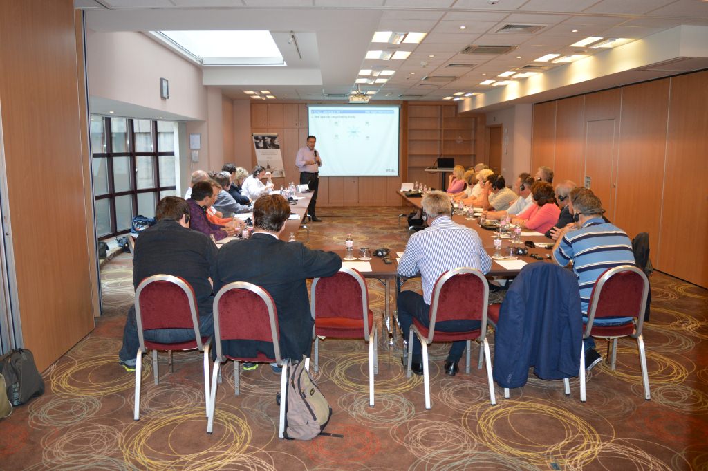 Első előadóként Bruno Demaitre az ETUI szakértője beszélt az európai Üzemi Tanácsokról. Az intézmény történeti kialakulásával kezdte, illetőleg azzal az igénnyel, amely a nyolcvanas években felmerült, először francia nagyvállalatoknál, ugyanakkor csak a kilencvenes években lett adott a jogi lehetőség létrehozni. Az Európai Üzemi Tanácsok száma ekkor dinamikusan nőtt, de a 2002-es év után megtört. A korábbi üzemi tanácsok részvevői köre az Európai bővítés nyomán kibővült, 2009/38-as direktíva „recast” directíva új lendületet adott a működésüknek.