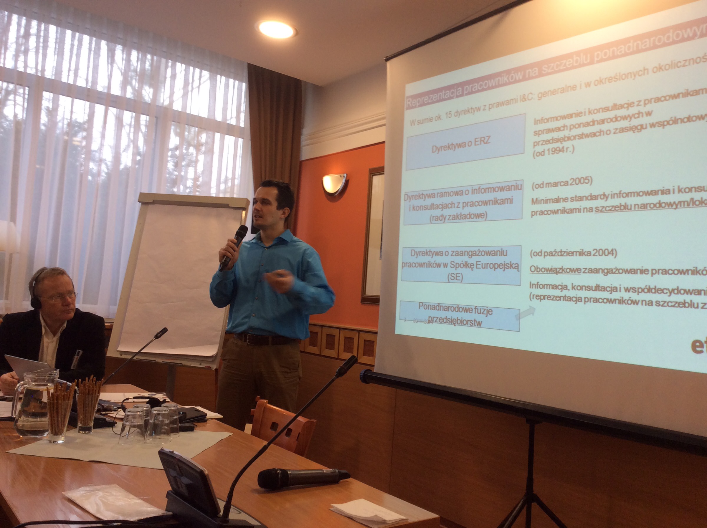 Robert Szewczyk, a Szolidarnos szakértője a lengyel munkaügyi kapcsolatok jellemzőit foglalta össze, majd az Európai Üzemi Tanácsokkal kapcsolatos konkrét tapasztalatairól, az irányelv átvételének problémáiról beszélt. Elmondta, hogy 2004 óta az idő előrehaladtával egyre több lengyel munkavállaló lett delegálva, vagy beválasztva Európai Üzemi Tanácsokba, így ezzel a lengyel munkavállalói képviselők tapasztalatai is nőttek. Mára kb. 500 fő vesz részt nemzetközi vállalatok EÜT-ainak munkájában. Szerinte az egyik legfontosabb eredménye az EÜT-oknek, hogy a hivatalos találkozók között a munkavállalók tartják egymással a kapcsolatot. Az előadó szerint az „emberi tényező” a legfontosabb hozzáadott értéke ezeknek a fórumoknak. Hitet tett amellett, a munkavállalók között kialakult emberi kapcsolatok mozgatják az együttműködést a szakmai kérdésekben. Véleménye szerint Lengyelországban még mindig nincsenek kihasználva az Európai Üzemi Tanácsok lehetőségei, több olyan nemzetközi cég működik Lengyelországban, amely a lehetőség ellenére nem alapított még Európai Üzemi Tanácsot. Az előadást követő kérdések főleg a lengyel szabályokra vonatkoztak, vagyis hogy mi a módja a képviselő kiválasztásának, illetve volt-e egyáltalán EÜT megalapítására próbálkozás. Példaként elhangzott, hogy a vegyi szektorban és a biztosítási cégek területén jelenleg is folyik az EÜT megalakítási folyamat.
