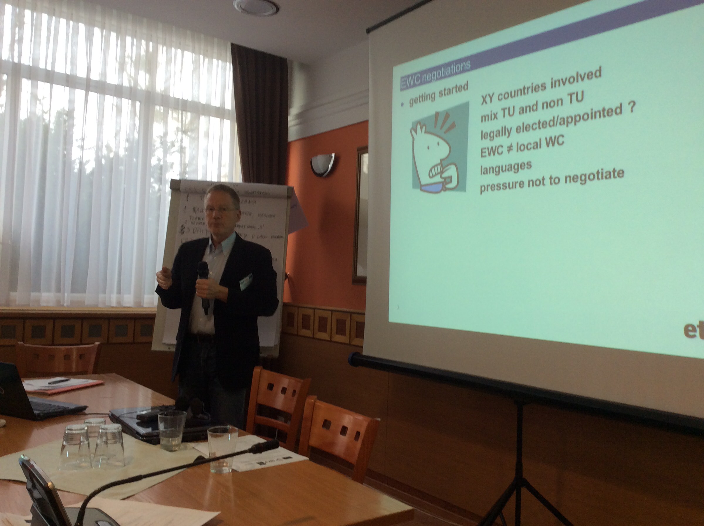 A résztvevők bemutatkozása után Gerhard Rohde ETUI tréner bemutatta az Európai Üzemi Tanácsok megalakításának jogi hátterét, szerepét, és azokat a problémákat, amelyekkel a testület megalakulása során a munkavállalók képviselői találkozhatnak.