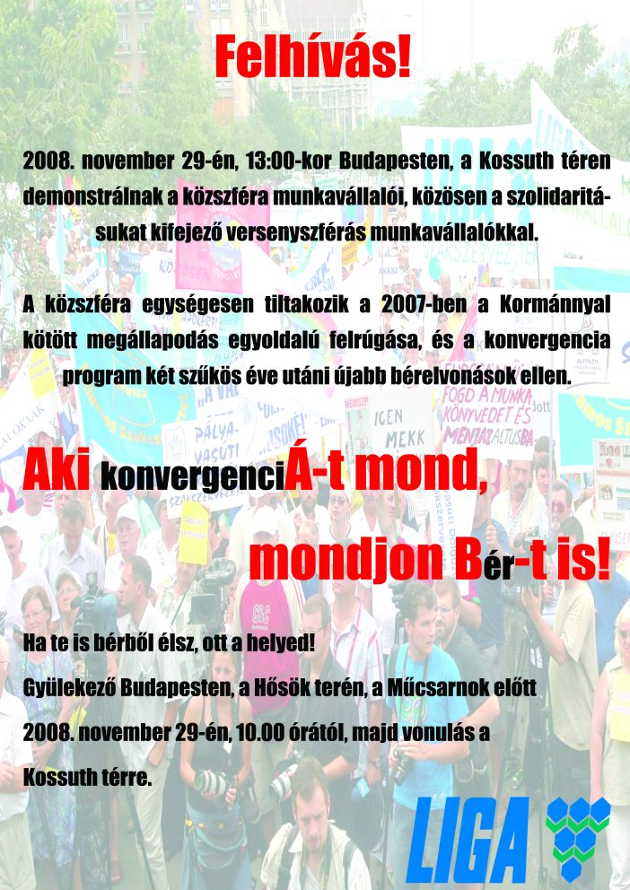 A közszféra munkavállalói 2008. november 29-én demonstrációt szerveznek Budapesten, a Kormány intézkedései és eljárásmódja ellen, amelyekkel egyoldalúan, előzetes egyeztetés nélkül felrúgták az elmúlt két év bérmegállapodásait. Ezzel az eddig is a konvergencia program terheit cipelő köztisztviselők és közalkalmazottak abba a lehetetlen helyzetbe kerültek, hogy legalább egy harmadik évben is el kellene viselniük béreik további csökkentését.