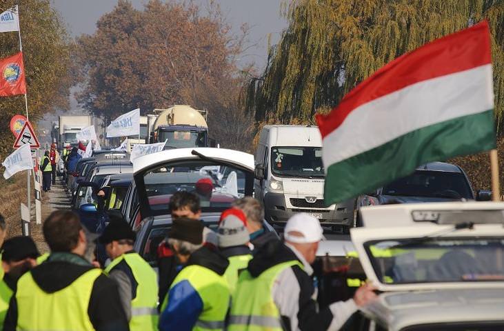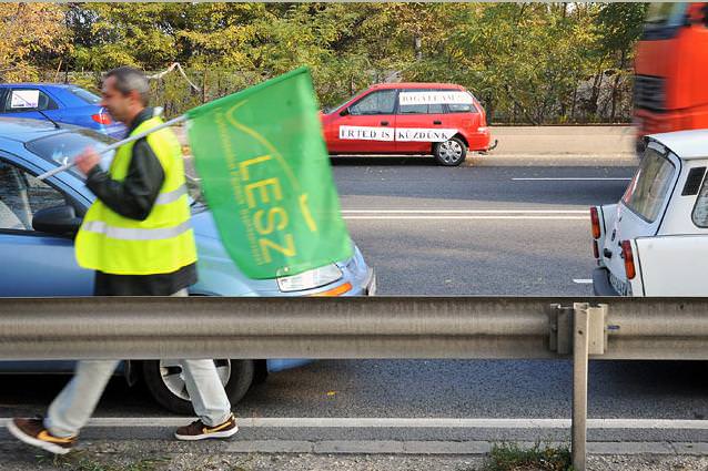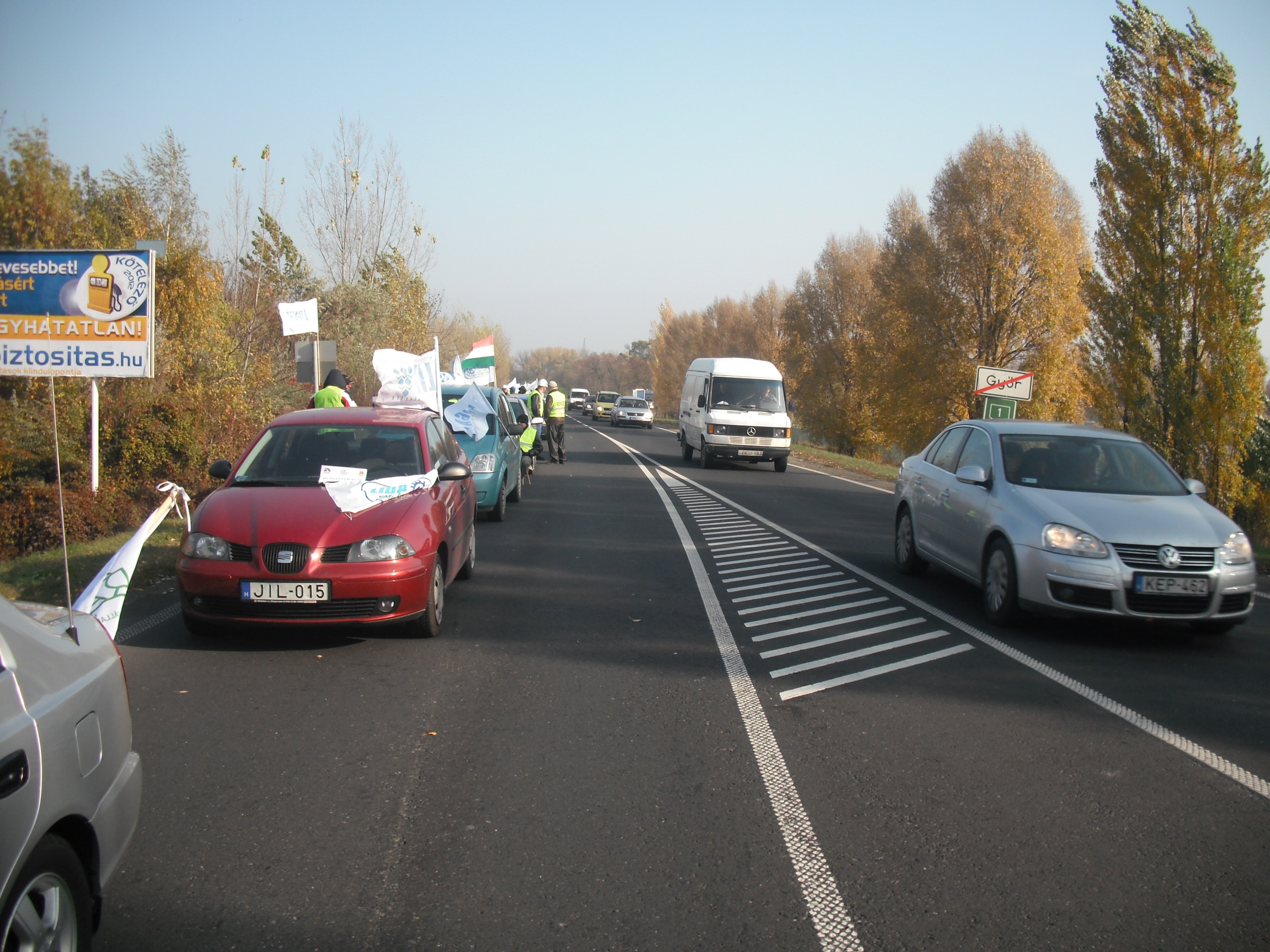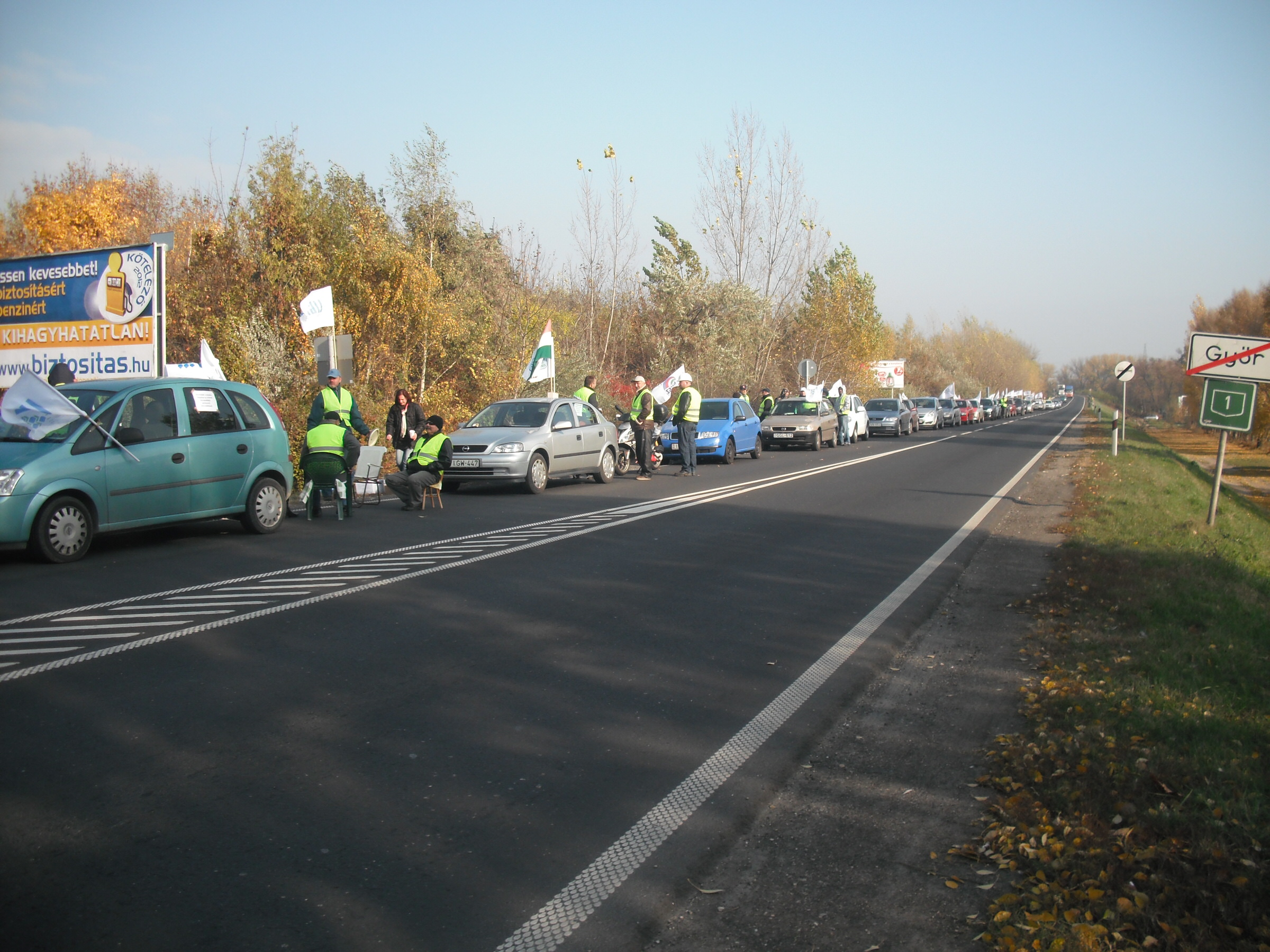 Lépésben halad a forgalom és csak az egyik sávon Győrben az 1-es úton, ahol 25 autóból álló konvojjal zárták el a félpályát a demonstrálók péntek reggel. Alper László, a tiltakozás helyi szervezője közölte, várhatóan egész nap tartani tudják ezt a létszámot. A feltorlódott autósok körül többen azt kiáltották nekik lehúzott ablakjuk mögül, hogy "Egyetértünk veletek! Jogos a tiltakozás!" Többen dudáltak és biztatóan integettek nekik. Csak egy autós mutatott bosszankodva egy nem szép jelet kezével.
