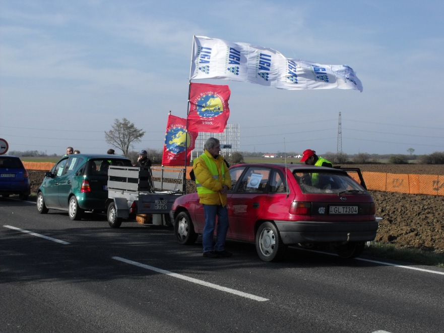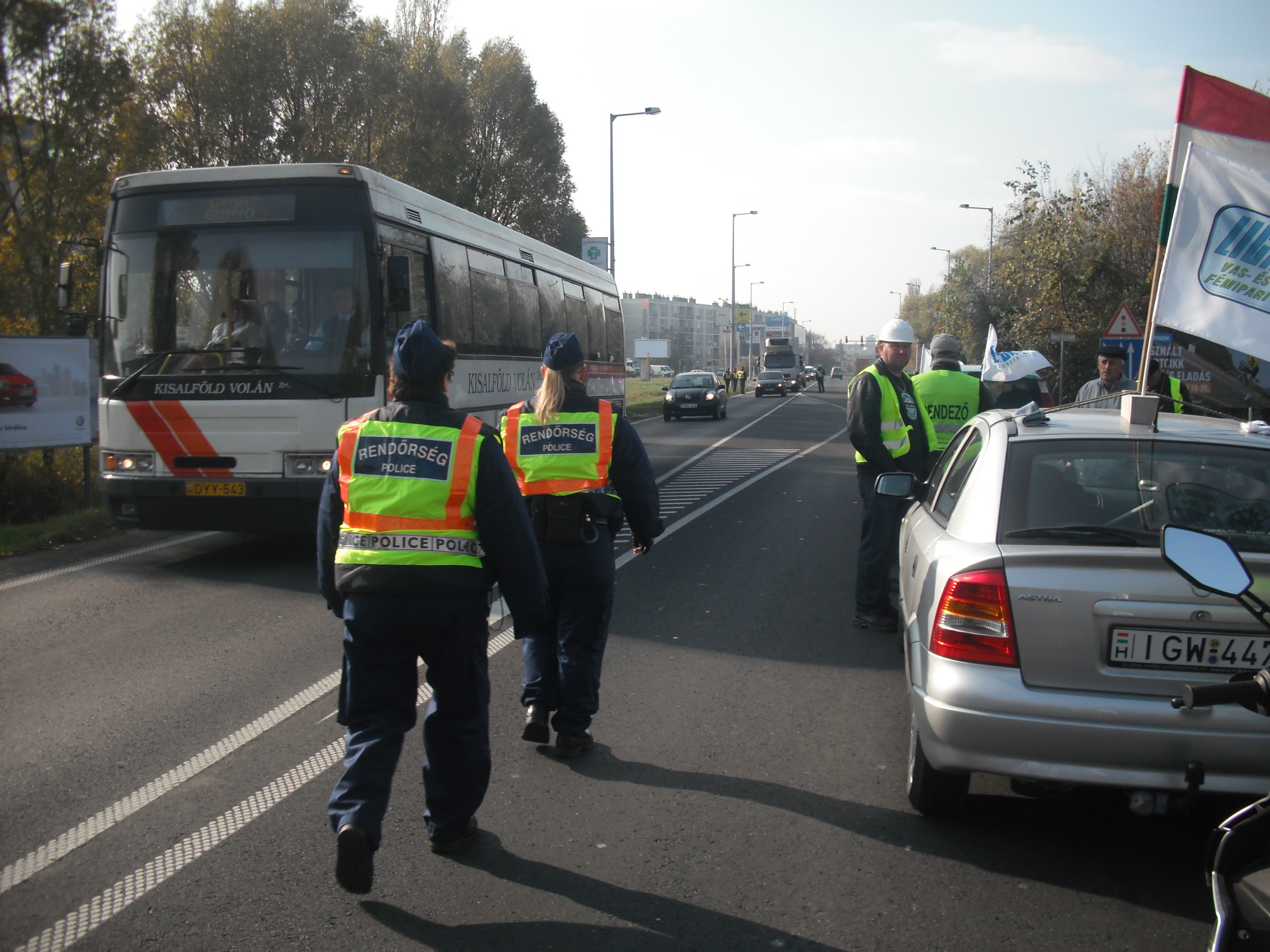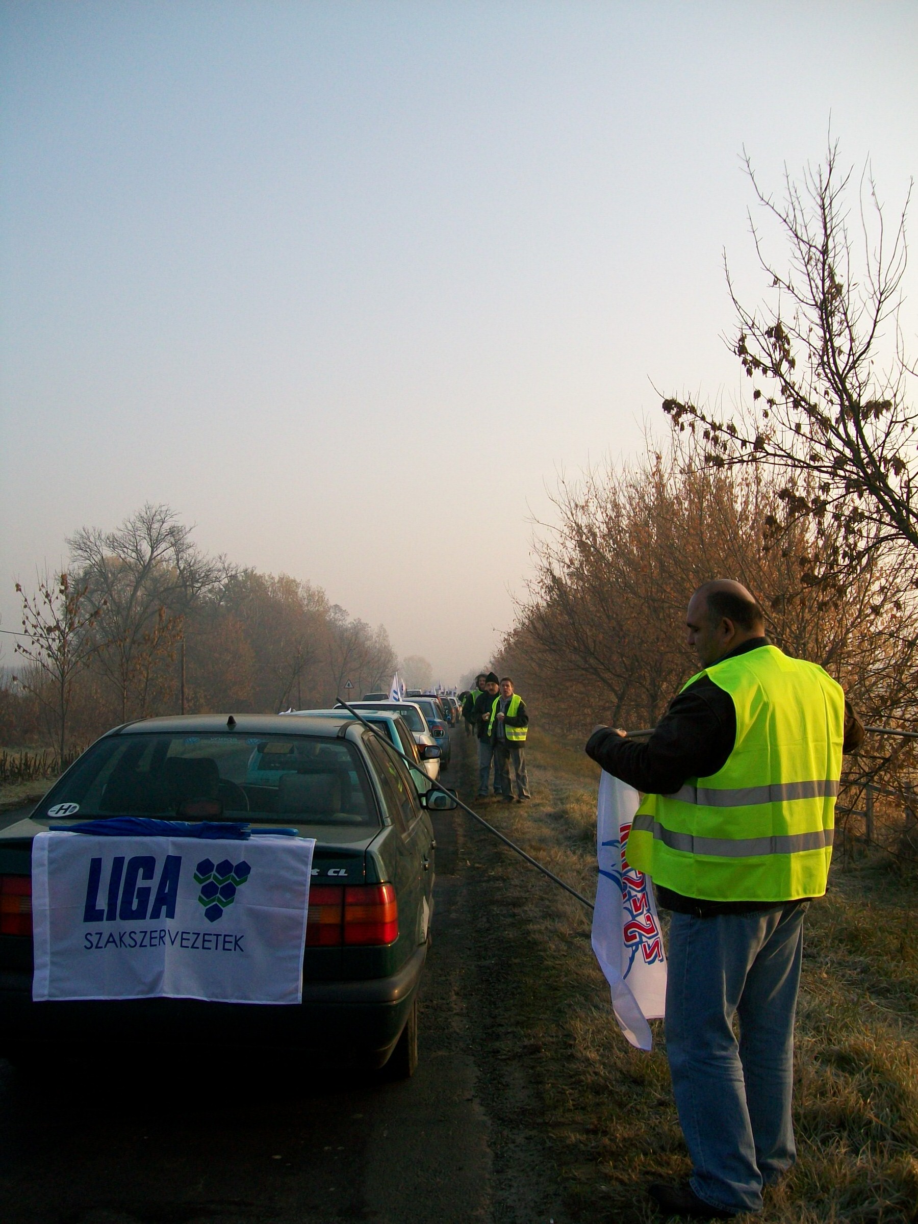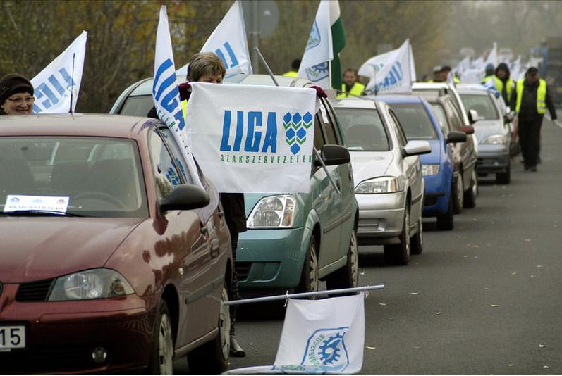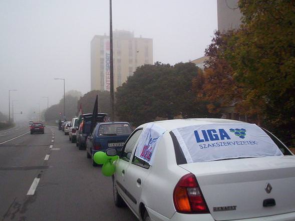 A kocsioszlop - amelynek több autóján az Audi Hungária Független Szakszervezet zászlója lobogott - percekkel hét óra után állította le fél pályán a forgalmat, már komótos felvonulásával is jelentős dugót okozva a rendszerint zsúfolt főúton. A járműgyári érdekképviselet mellett a Rába Rt. Munkavállalók Szakszervezete és a Vasas Szakszervezeti Szövetség csatlakozott helyben a Liga országos akciójához.