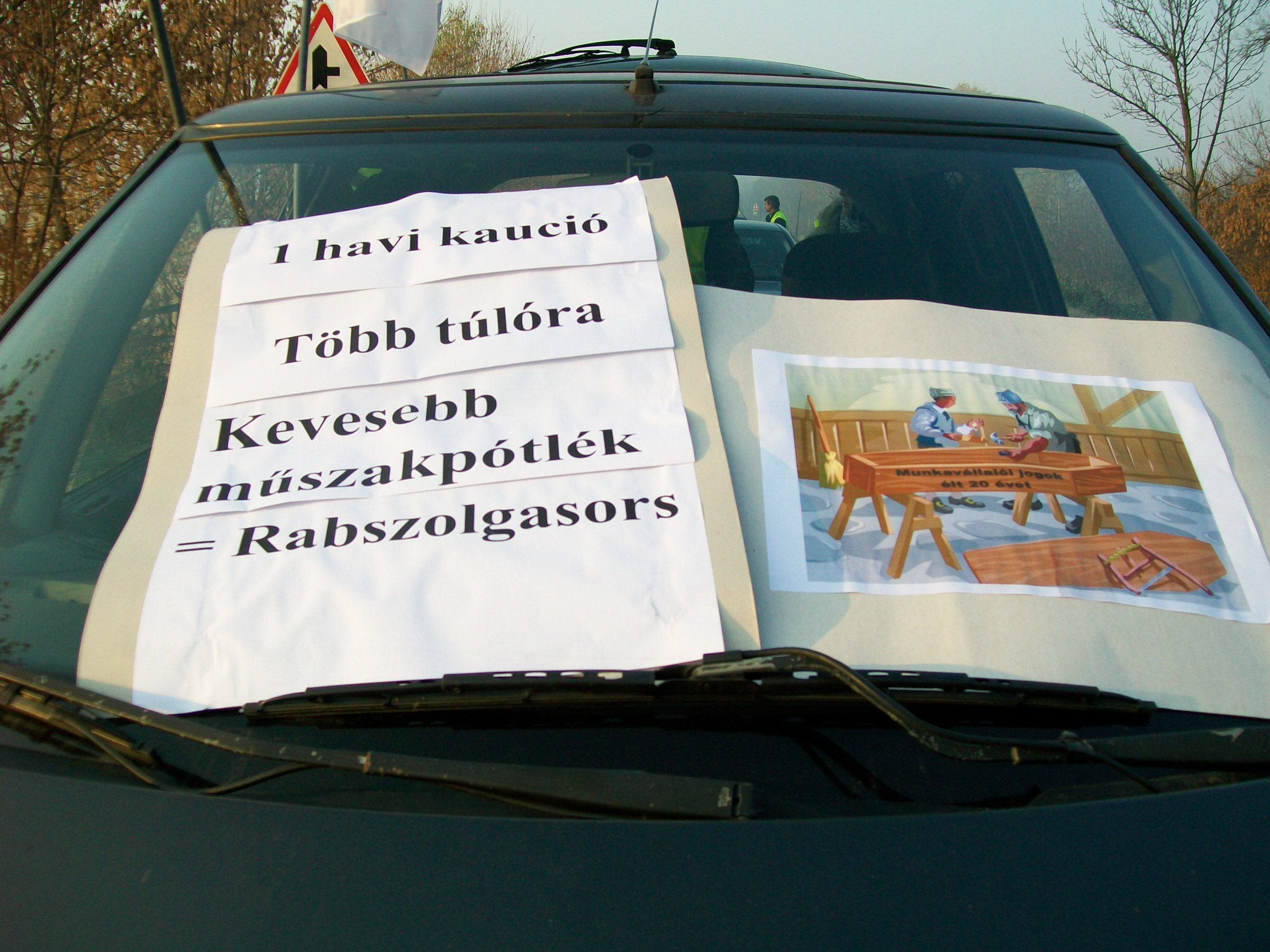 A Salgótarjánt elkerülő főúton tíz autóval kezdődött meg a forgalomlassító demonstráció. A táblákon "Nem ezt ígértétek", illetve "Rabszolgák lettünk" felirat olvasható. Cseke Tibor szervező, a Vasúti Dolgozók Szabad Szakszervezetének salgótarjáni ügyvivője elmondta, sem káoszt, sem rendbontást nem akarnak, céljuk a figyelem felhívása, ezért a demonstráció helyszínéül egy hosszú, egyenes útszakaszt választottak, hogy a forgalmat csak minimális mértékben akadályozzák.