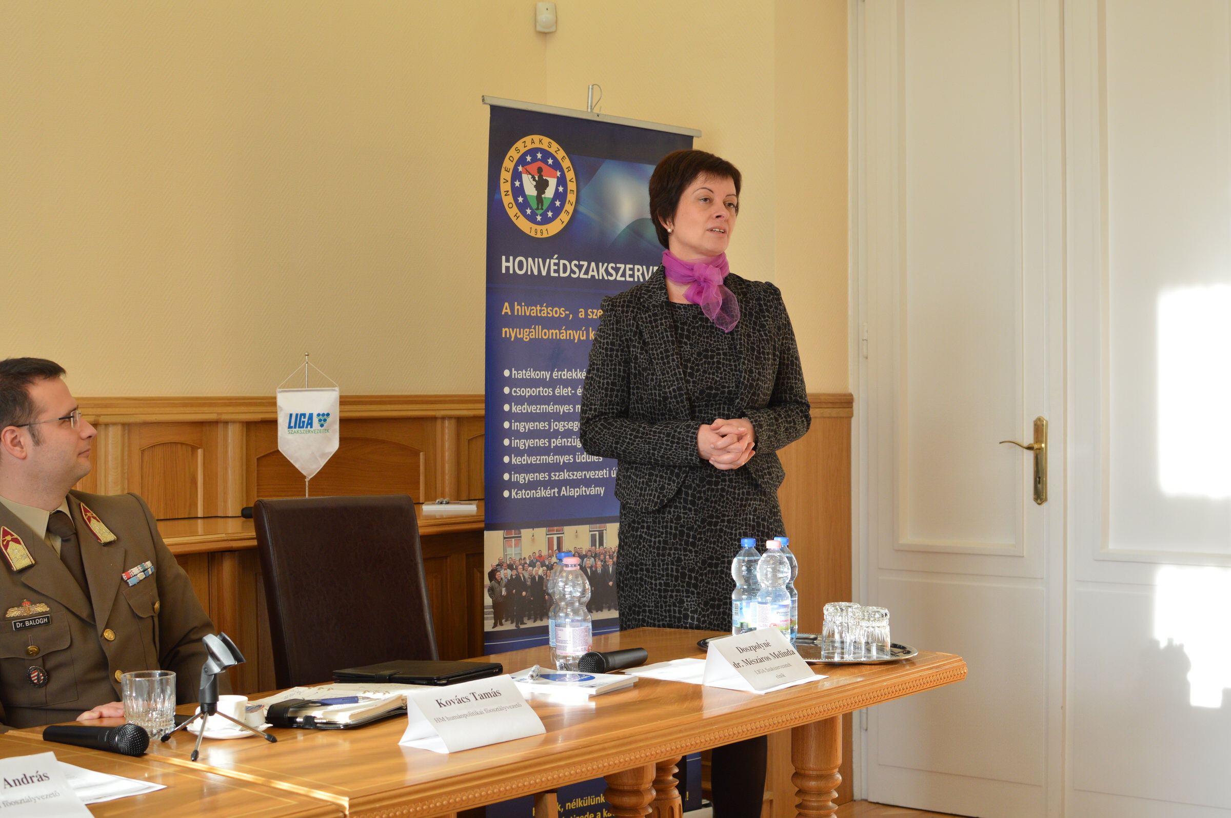 Elsőként Doszpolyné dr. Mészáros Melinda a LIGA Szakszervezetek elnöke köszöntötte a minisztériumból és az érdekképviseletek részéről érkezett résztvevőket, és külön üdvözölte a LIGA Szakszervezetek nem fegyveres tisztségviselőt, akik jelenlétével, mint mondta, a civil összefogás erősödik. A találkozó fontos kérdéseinek nevezte annak vizsgálatát, hogy milyen életet élnek és milyen munkakörülmények között dolgoznak a Magyar Honvédség hivatásos és szerződéses katonái, és milyen juttatási rendszert biztosít a nyugállományba vonuló kollégáknak a tárca.