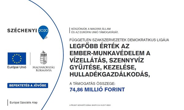 2018.04.24A Független Szakszervezetek Demokratikus Ligája és a Munkástanácsok Országos Szövetsége és a Stratégiai és Közszolgáltató Társaságok Országos Szövetsége megkezdte a közel 75 millió forintos támogatást elnyert pályázata megvalósítását, hogy a „vízellátás, szennyvíz gyűjtése, kezelése, hulladékgazdálkodás, szennyeződésmentesítés” nemzetgazdasági ágazatban munkavédelmi képzések és tananyagok valósuljanak meg, valamint egy ágazati kutatás jöjjön létre.
